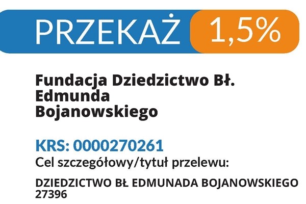 Fundacja Dziedzictwo Bł. Edmunda Bojanowskiego pragnie jednoczyć ludzi wokół dobra, troszczyć się o wychowanie patriotyczne i moralne oraz działać na rzecz społeczności lokalnej. Przekazując 1,5 % podatku pomagasz ochraniać dziedzictwo „serdecznie dobrego człowieka”. Dzieląc się 1,5 % podajesz dobro, które pomoże odbudować rodzinny dom Błogosławionego i stworzyć miejsce kultury i edukacji.