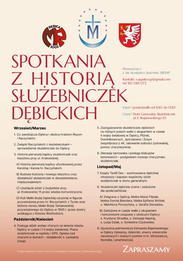 Spotkania z historią odbywać się będą od września w poniedziałki w Domu Generalnym w Dębicy. Zaproszenie kierowane jest do wszystkich w zorganizowanych grup z dziećmi, młodzieżą czy dorosłymi. Tematyka spotkań umieszczona jest na plakacie wraz z kontaktem do prowadzącej lekcje s. dr Agnieszki Skrzypek.