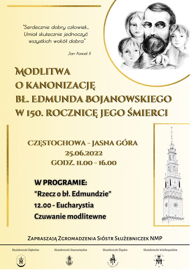 Szukaj jedynej pociechy i opieki u stóp Najświętszej Panny… napisał do s. Leony bł. Edmund Bojanowski. Sam niejednokrotnie był dla wszystkich, których spotykał przykładem ufnego zawierzenia i wielkim czcicielem Maryi. Kończąc Rok 150 rocznicy śmierci tego „wielkopolskiego ziemianina jednoczącego wokół dobra” jak powiedział podczas homilii beatyfikacyjnej św. Jan Paweł II pragniemy spotkać się na wspólnej modlitwie. Wszystkich czcicieli bł. Edmunda Bojanowskiego, szkoły które noszą jego imię, parafie, Rodziny bł. Edmunda i każdego kto pragnie przybyć do Matki Bożej Jasnogórskiej – zapraszamy na wspólne spotkanie.